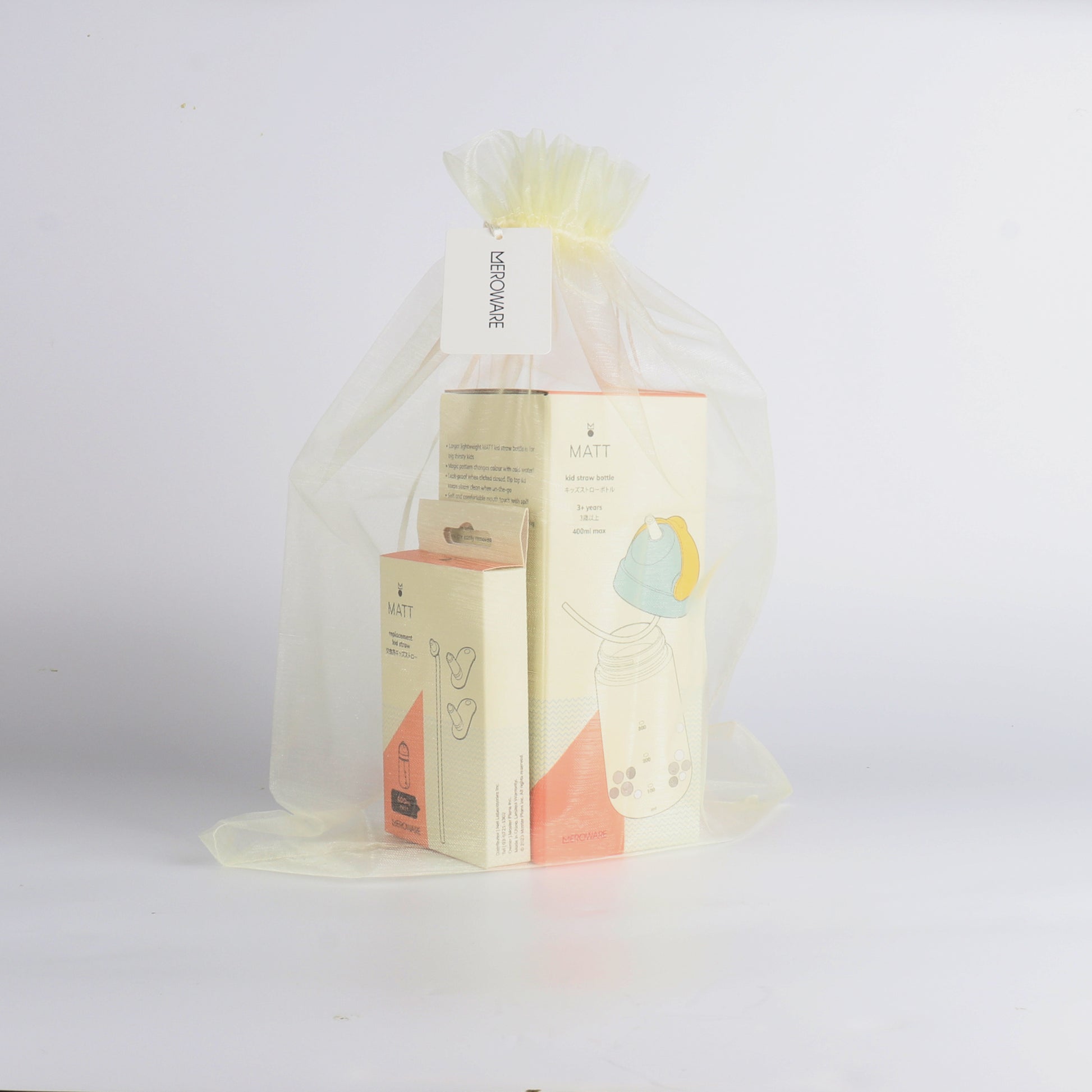 その『MATT ストローボトル』と『交換用ストロー』をセットにして、merowareオリジナルギフトタグ付きのメッシュバッグにラッピングしました。
