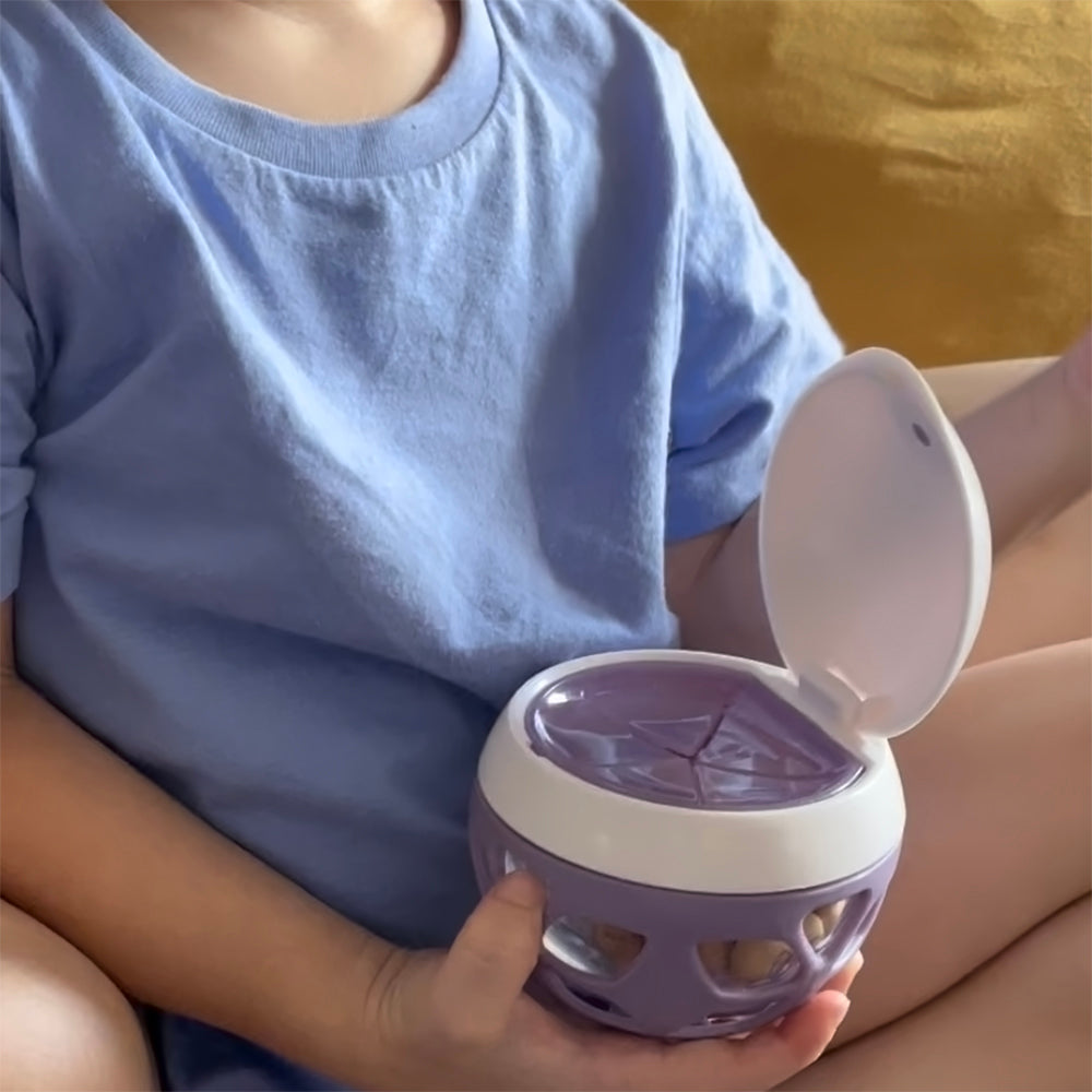 おやつの時間に感覚的な遊びができるELLE スナックボールは、単なるおやつケースではありません。ボールの形をしているので、転がったELLEを子どもたちは自分から手に取って、握り方を楽しく学ぶことができます。