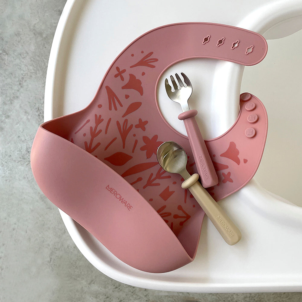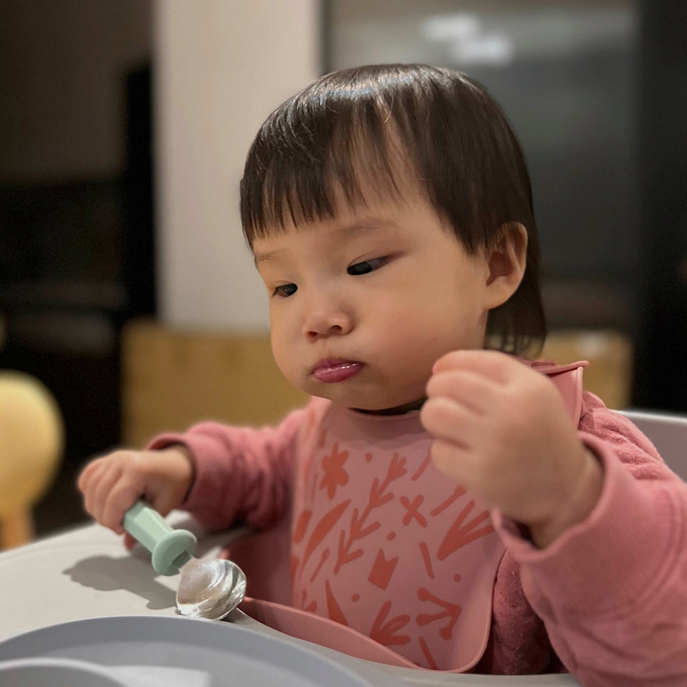 シンプルでおしゃれなGINA シリコンビブは、赤ちゃんが自分で食べる練習をするときに、身の回りが汚れるのを防いでくれます。