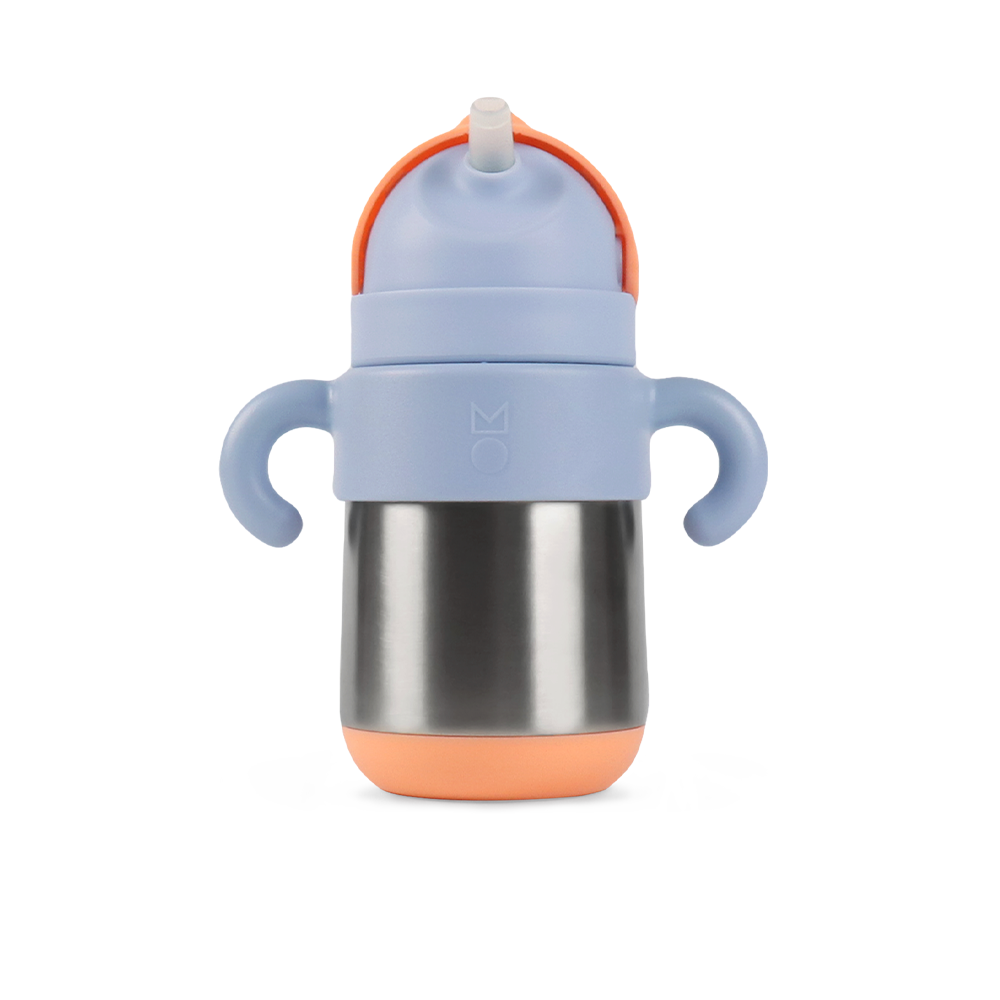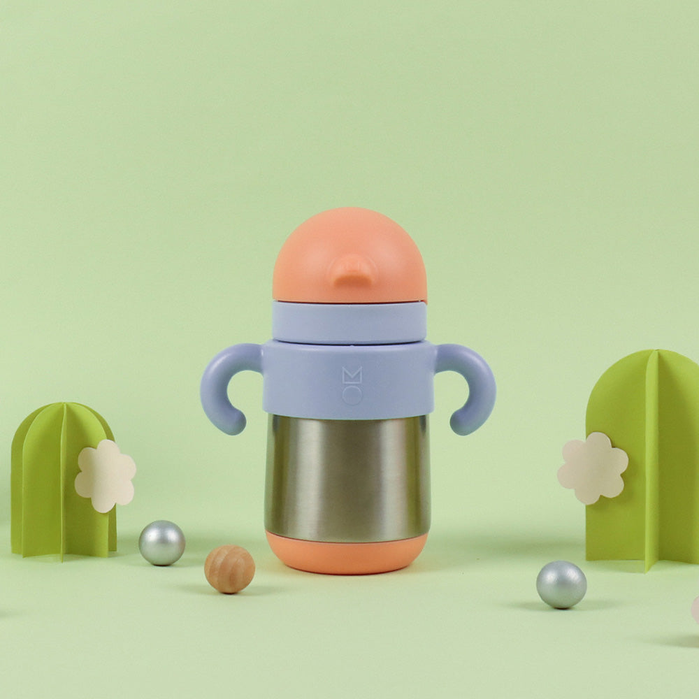 幼児期に入った赤ちゃんから使えるこのステンレスボトルは、子どもが自分で持てる重さで、万が一落とした時のために底面が補強されています。