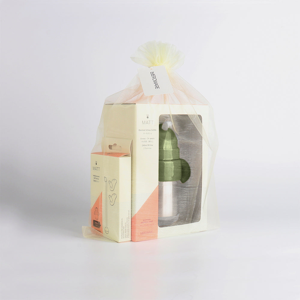 その『MATT サーモボトル』と『交換用ストロー』をセットにして、merowareオリジナルギフトタグ付きのメッシュバッグにラッピングしました。