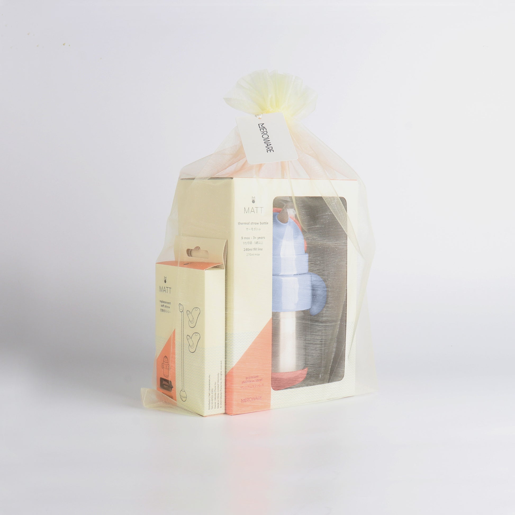 その『MATT サーモボトル』と『交換用ストロー』をセットにして、merowareオリジナルギフトタグ付きのメッシュバッグにラッピングしました。