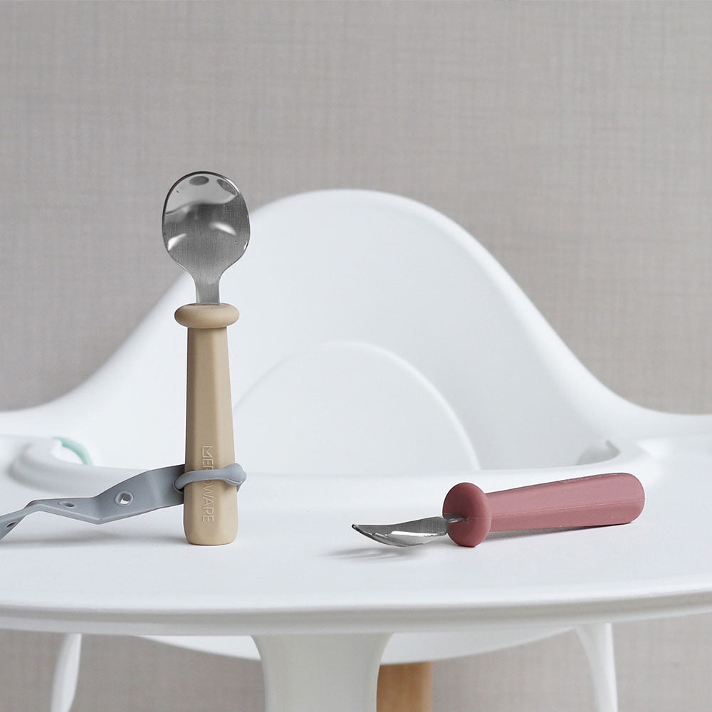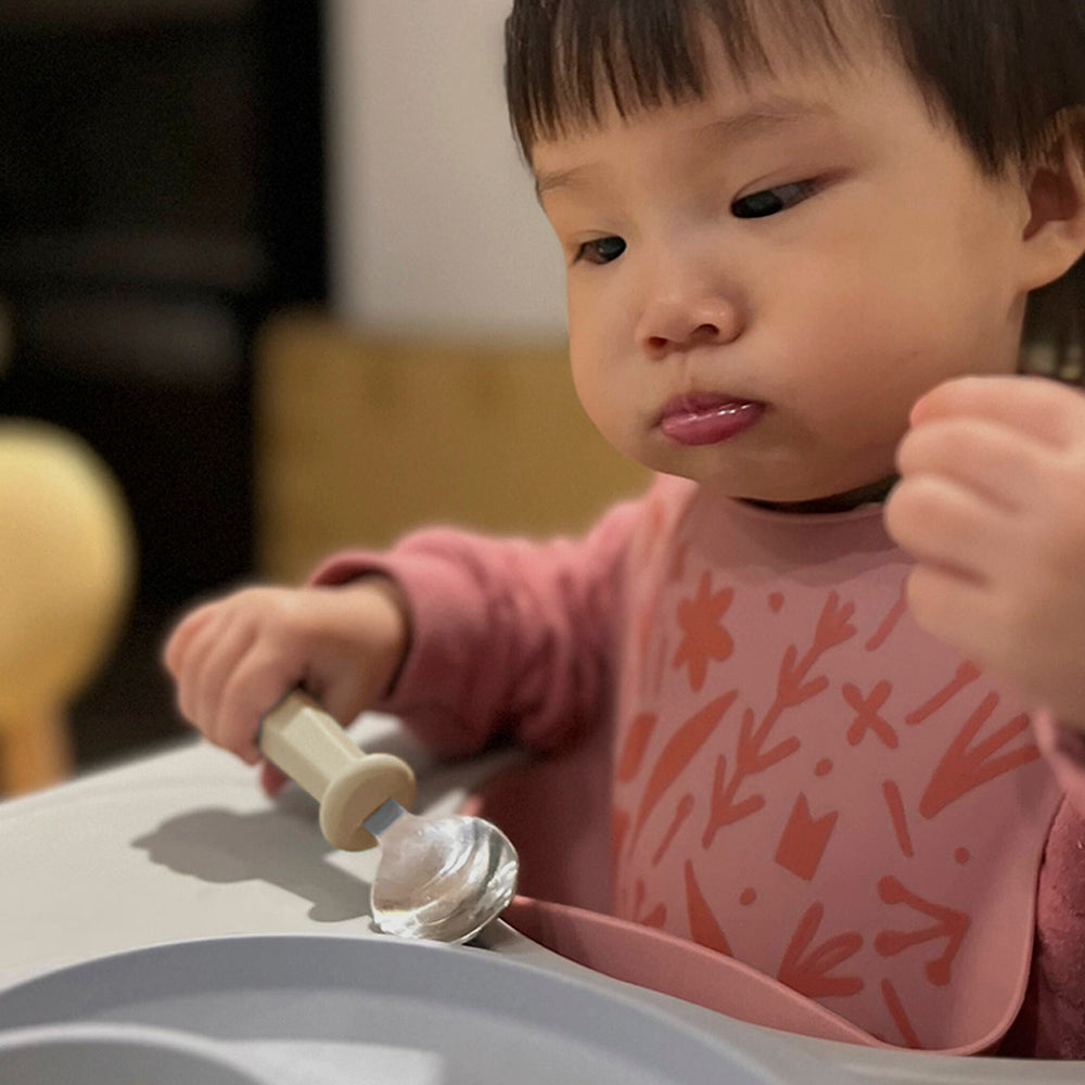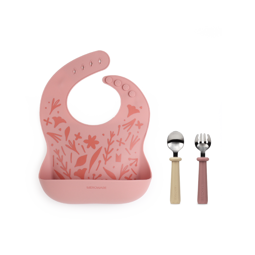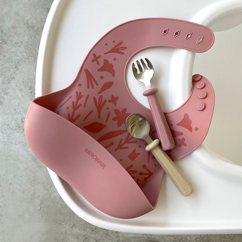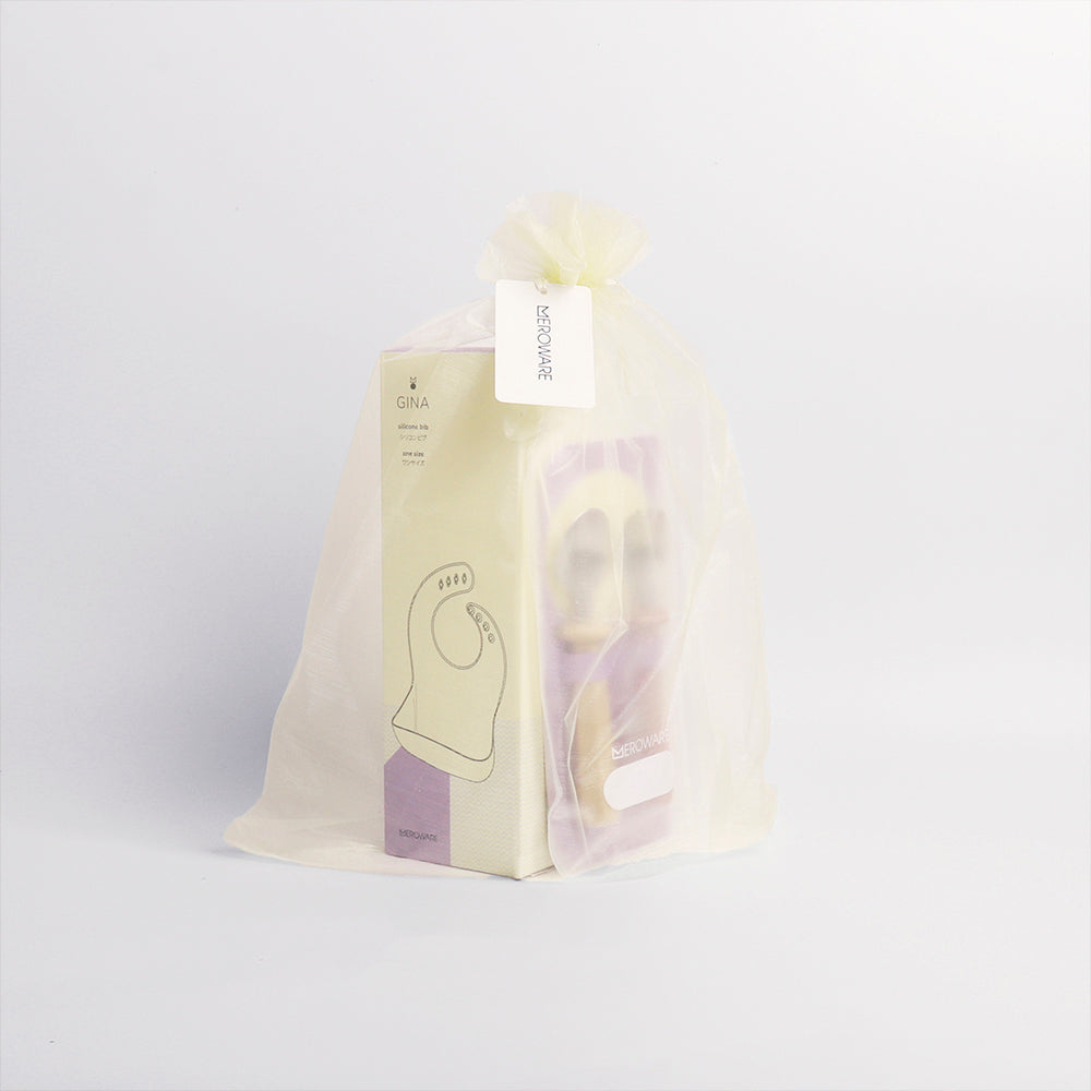 NANA スプーン・フォークセットとGINA シリコンビブが、merowareのギフトタグ付きメッシュバッグに入っています。ギフトとしてはもちろん、使わないときの収納にも便利です。