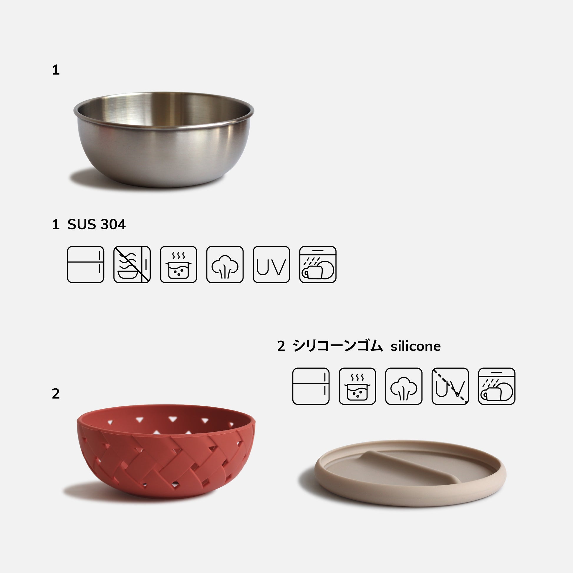 TAMIボウルは、料理の下ごしらえ、盛り付け、保存に使えるステンレス製の蓋付きボウルです。